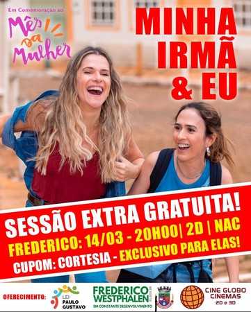 Nesta terça-feira, 12 e na quinta-feira, 14 de março, às 20 horas, o Cine Globo Cinemas de Frederico Westphalen por intermédio da Prefeitura de Frederico Westphalen com recursos da Lei Paulo Gustavo será oferecido às mulheres ingressos cortesia para sessão extra do filme nacional “Minha irmã e eu”.