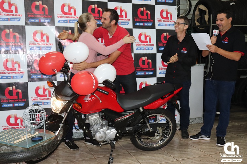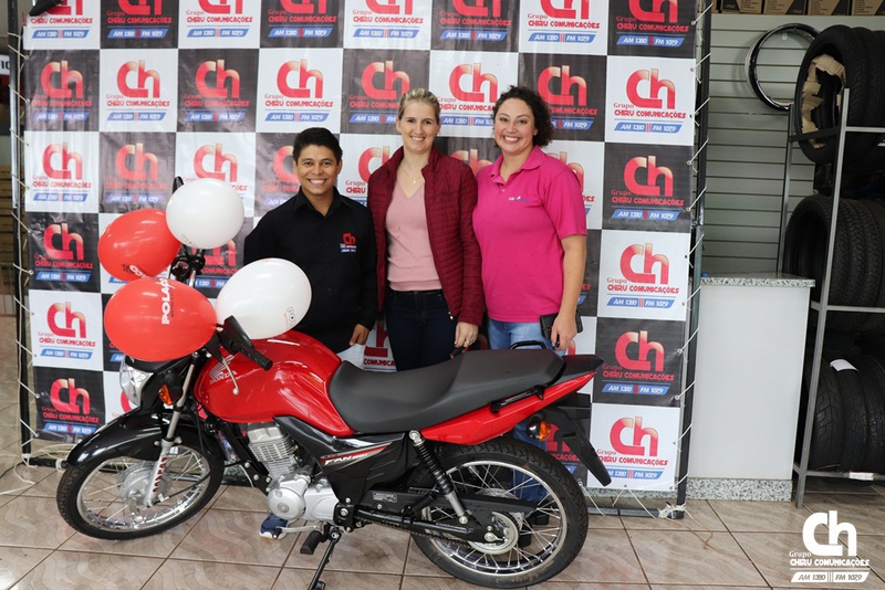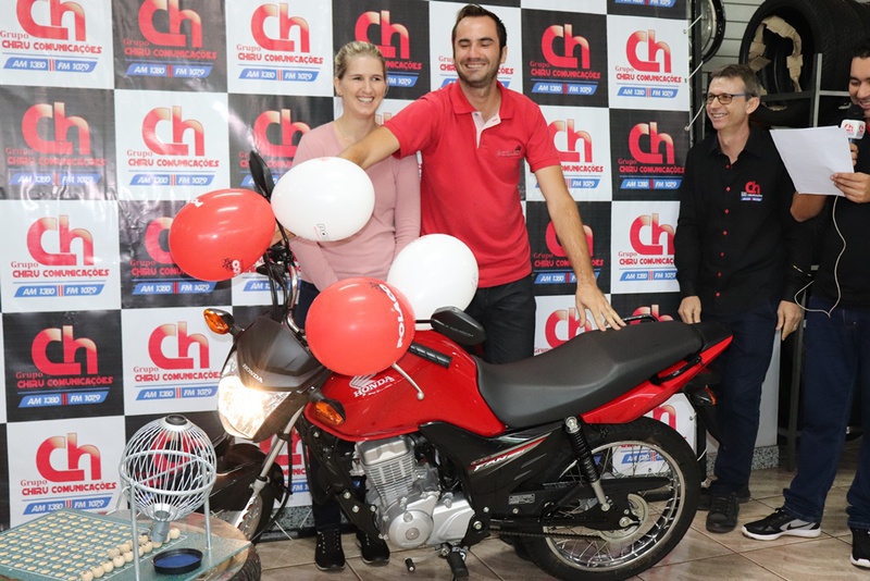 Denise Furini, cliente da Vet Center foi a ganhadora, na região Celeiro, da motocicleta sorteada pelo Grupo Chiru Comunicações, através da Promoção Grupo Chiru 28 Anos - Um amor de rádio!. Em virtude da instabilidade climática, o sorteio que seria realizado na Praça do Índio ocorreu na Polaco Motos.