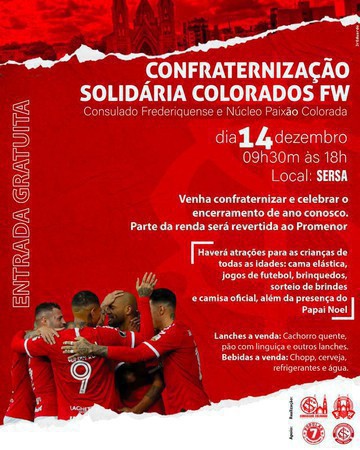 O Consulado Frederiquense e o Núcleo Paixão Colorada promovem confraternização solidária. O evento será realizado na SERSA, dia 14 de dezembro, das 9h30 às 18h, com entrada gratuita.