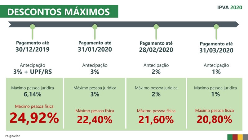 A partir desta terça-feira, 17 de dezembro, já é possível efetuar o pagamento do IPVA 2020. Os contribuintes que optarem pela quitação antecipada até 30 de dezembro poderão ter desconto máximo de 24,92% (considerando todos os abatimentos) sobre o valor do imposto.