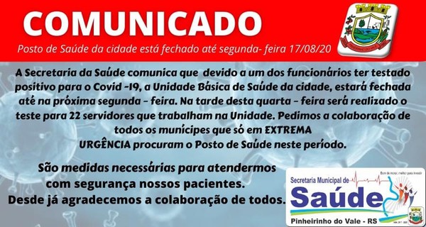 A Secretaria de Saúde de Pinheirinho do Vale emitiu um comunicado de fechamento temporário da unidade de saúde do centro da cidade até a próxima segunda-feira, 17. A orientação é que a comunidade só busque o posto de saúde em casos de extrema urgência.