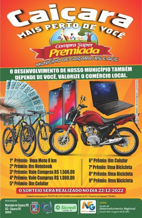 O sorteio da Compra Premiada de 2022 do município de Caiçara será realizado no dia 22 de dezembro, quinta-feira, durante o evento Show de Natal, na Praça Otacildo Osório Pivetta (Praça do Lago).