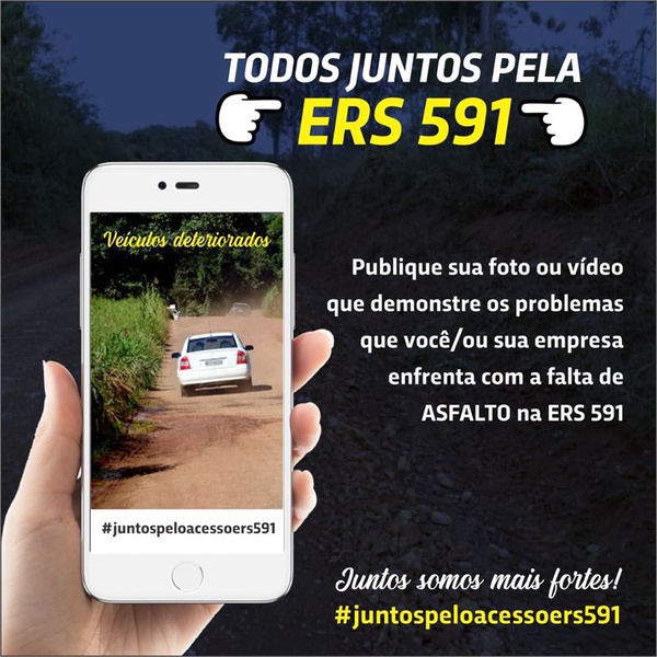 A campanha convida a população regional, e até mesmo pessoas de outras regiões que passaram pela rodovia, a postarem nas redes sociais fotos que demonstrem a precariedade do trecho. “Publique sua foto ou vídeo que demostre os problemas que você e/ou sua empresa enfrenta ou já enfrentou com a falta de asfalto na ERS-591 e utiliza a hashtag juntos pelo acesso ERS-591 (#juntospeloacessoers591)”, diz o texto das publicações.