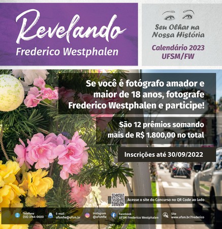 O Projeto de Extensão da UFSM/FW, "Revelando Frederico Westphalen: Seu Olhar na Nossa História", em parceria com a Prefeitura de FW, Câmara de Vereadores e empresa Conceito A, prorrogou as inscrições para o concurso fotográfico até 30 de setembro, sexta-feira. Fotógrafos amadores, amantes da arte, maiores de 18 anos podem enviar até duas fotografias, que devem ser obrigatoriamente do município de Frederico Westphalen ao formulário disponibilizado pelo projeto.