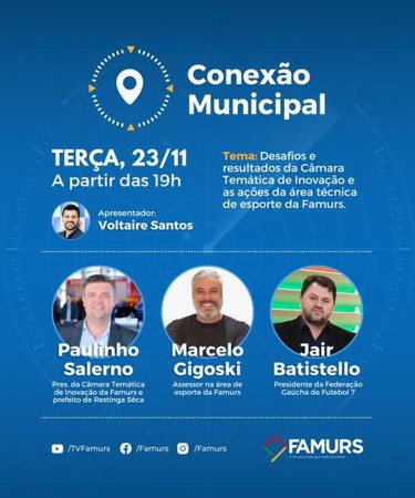 O Conexão Municipal também receberá o assessor técnico de Esporte e Lazer da Famurs, Marcelo Gigoski, e o presidente da Federação Gaúcha de Futebol 7, Jairzinho Batistello. Os convidados irão apresentar as ações voltados ao esporte no RS e a parceria das entidades na realização da Copa Integração 2021/22 de futebol sete amador.