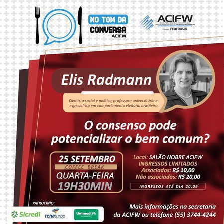 A cientista social e política, Elis Radmann, participa do No Tom da Conversa, nesta quarta-feira, 25, às 19h30, no auditório da ACI de Frederico Westphalen, com o tema “O consenso pode potencializar o bem comum?”.