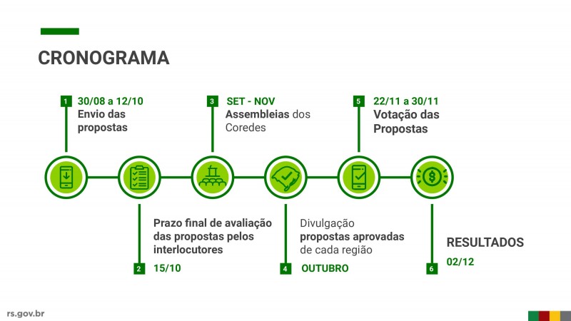 As propostas serão encaminhadas em formato de postagem, com descrição da ideia de forma direta, com justificativa da importância para a região. O cidadão terá um limite de 120 caracteres para escrever a proposta, podendo utilizar-se de foto para melhor ilustrar, e poderá consultar os Planos Estratégicos de Desenvolvimento (PED) de cada Corede.