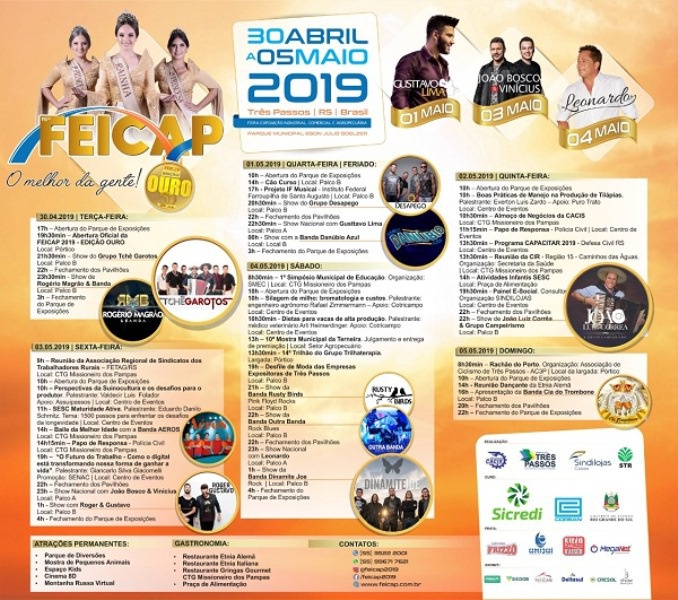 Uma variada programação foi organizada para a Feira de Exposição Industrial, Comercial e Agropecuária de Três Passos (FEICAP), que acontece em menos de 15 dias, no Parque Municipal de Exposições Egon Júlio Goelzer.