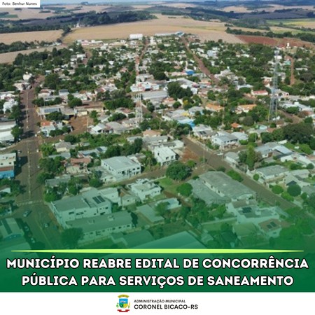 O município de Coronel Bicaco reabriu o Edital de Concorrência Pública nº 04/2024 para exploração, sob regime de concessão, dos serviços relativos à gestão, estruturação de projetos de implantação, expansão, restauração, operação e manutenção do Sistema de Abastecimento de Água (SAA) e Sistema de Esgotamento Sanitário (SES).