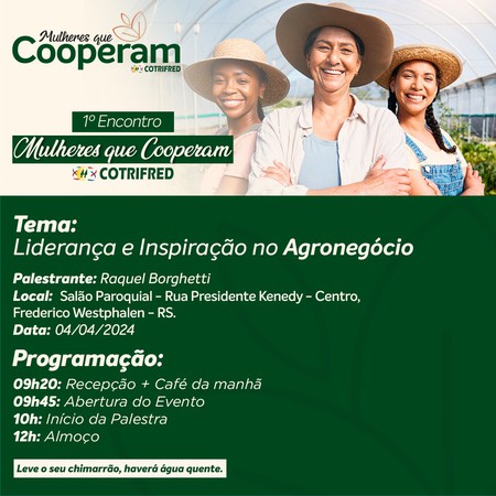 A Cooperativa Tritícola de Frederico Westphalen (Cotrired) promove, no dia 4 de abril, a partir das 9 horas, o 1° Encontro de Mulheres que cooperam, no salão paroquial em Frederico Westphalen.