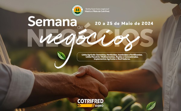 A tradicional Semana de Negócios realizada pela Cotrifred, acontecerá nos dias 20 a 25 de maio, em todas as unidades da Cotrifred. O momento é especial para associados, produtores e clientes que buscam fazer bons negócios, com vantagens e oportunidades. O objetivo do evento é levar informações sobre o mercado de grãos e manejo de culturas de milho e soja.