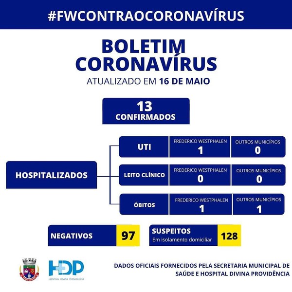 O novo boletim da Covid-19 divulgado pelo município de Frederico Westphalen e Hospital Divina Providência (HDP), confirma 13 casos da doença no município, neste sábado, 16.