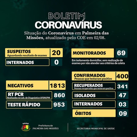 A Secretaria Municipal de Saúde de Palmeira das Missões, através do Centro de Operações Emergenciais (COE), informa a ocorrência do nono óbito por Covid-19 no município, no sábado, 1º de agosto.⠀