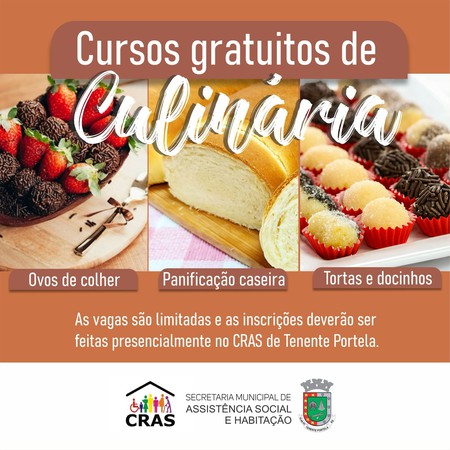O Centro de Referência de Assistência Social (Cras) de Tenente Portela está com inscrições abertas para três cursos de capacitação na área de culinária que acontecerão durante o mês de março: Tortas e Docinhos, Panificação Caseira e Ovos de Colher.