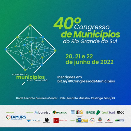 A Famurs vai realizar entre os dias 20 e 22 de junho a 40ª edição do Congresso de Municípios do Rio Grande do Sul. Com o tema “conectar os municípios com o amanhã”, o evento será realizado em Restinga Sêca e marcará o fim da gestão Eduardo Bonotto e início do anuênio presidido por Paulinho Salerno. Para melhorar a recepção dos gestores e participantes do evento, o credenciamento será iniciado na noite se segunda-feira (20/6), das 19h às 21h, diretamente no Centro de Eventos do Hotel Recanto Business Center. Nos demais dias, o credenciamento irá funcionar normalmente.
