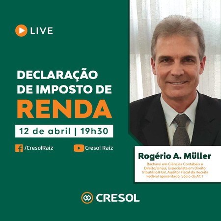 A Cresol Raiz, com sede em Frederico Westphalen, realiza na próxima segunda-feira, 12 de abril, a partir das 19h30, live com o tema “Declaração do Imposto de Renda”.