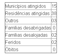 No município de Soledade, um ginásio foi destruído pela força do vento – não houve registro de feridos. No total, 15 cidades já registraram danos ocasionados por chuva forte, vento intenso e granizo.