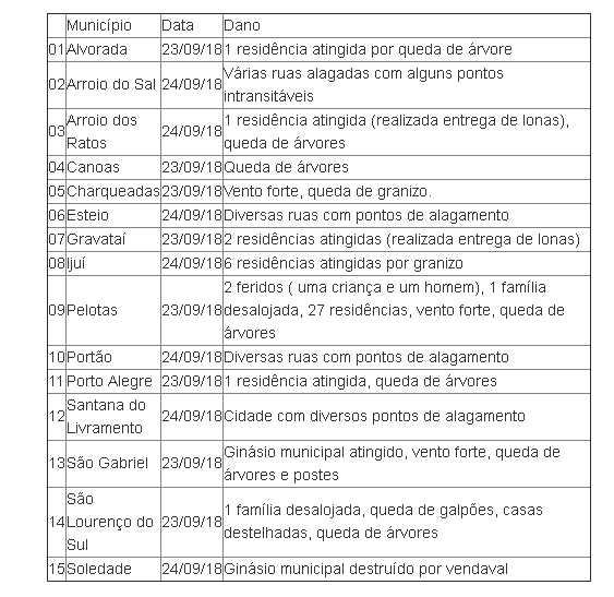 A Defesa Civil segue com o acompanhamento das Coordenadorias Regionais em conjunto com os municípios, oferecendo toda ajuda necessária às localidades atingidas. Qualquer informação ou pedido de auxílio pode ser encaminhado através do telefone 199.
