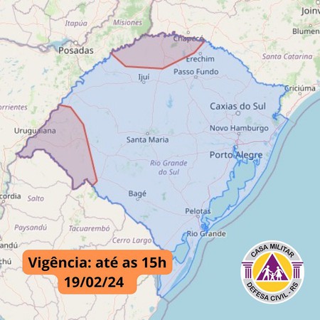 A Defesa Civil do Rio Grande do Sul emitiu na manhã desta segunda-feira, 19 de fevereiro, alerta para chuvas e ventos pontualmente fortes, descargas elétricas e eventual queda de granizo na região norte do estado e na faixa de fronteira com a Argentina e Uruguai.