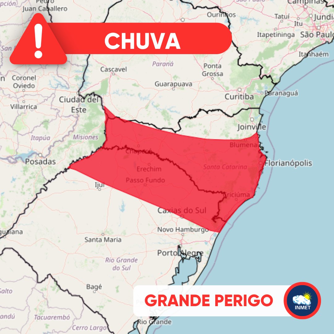 De acordo com o Instituto Nacional de Meteorologia (Inmet), o volume total de chuva pode superar os 100 milímetros (mm) em 24h. O alerta vermelho de grande perigo deve atingir também Santa catarina e parte do Paraná.