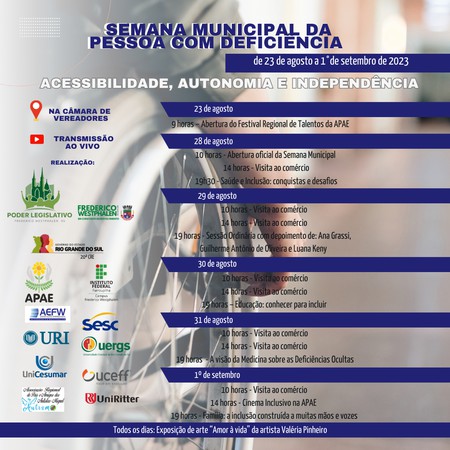 Os eventos prosseguirão até a sexta-feira, 1º de setembro, e contarão com visitas ao comércio, Sessão Ordinária com depoimentos de pessoas com deficiência e painéis/debates sobre “Saúde e inclusão: conquistas e desafios”, “Educação: conhecer para incluir”, “A visão da Medicina sobre as deficiências ocultas” e “Família: a inclusão construída a muitas mãos e vozes”. Também haverá Cinema Inclusivo do Sesc na Apae e a exposição de arte “Amor à vida”, da artista plástica Valéria Pinheiro, nas dependências da Câmara de Vereadores.