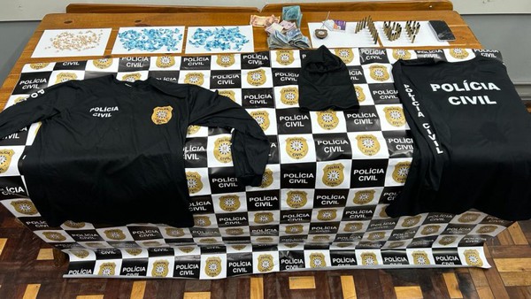 Foram apreendidas 144 porções de crack, 189 porções de cocaína, 14 munições de fuzil calibre 556, 24 munições de calibre .38, um celular, um banner com símbolo da PCRS, duas camisetas com símbolo da PCRS, uma touca ninja “balaclava”, um distintivo com símbolo da PCRS, dois chips de celular e R$ 1.247,00 em dinheiro.