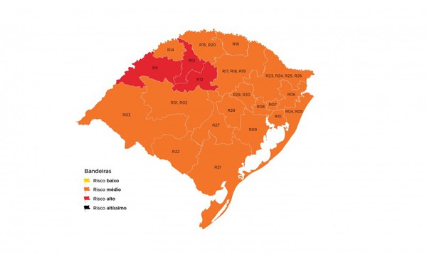 Depois de duas rodadas sem regiões classificadas como risco epidemiológico alto, o mapa preliminar da 25ª semana do modelo de Distanciamento Controlado no Rio Grande do Sul divulgado na sexta-feira, 23, voltou a apresentar bandeira vermelha. Presentes também há duas rodadas, as bandeiras amarelas (risco epidemiológico baixo) deram lugar, novamente, a bandeiras laranjas (risco epidemiológico médio), como é o caso da macro de Palmeira das Missões.