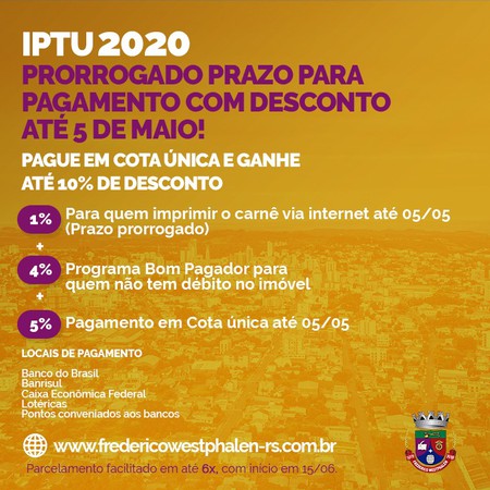 Segue até a próxima terça-feira, 5 de maio, o prazo para os contribuintes de Frederico Westphalen garantirem até 10% de desconto no pagamento em cota única do Imposto Predial e Territorial Urbano (IPTU). A prorrogação do prazo foi feita através de Decreto Municipal.