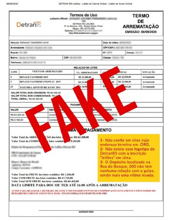 Os criminosos chegaram a forjar um falso “Termo de Arrematação”, bastante elaborado e que traz até a marca do DetranRS acrescida da palavra “leilões” em seu cabeçalho, para tentar dar mais credibilidade ao golpe. Costumam informar o endereço de um Centro de Remoção e Depósito credenciado ao DetranRS, localizado na Rua do Bosque, 200, em Porto Alegre, mas o CRD não tem nenhuma relação com os estelionatários.