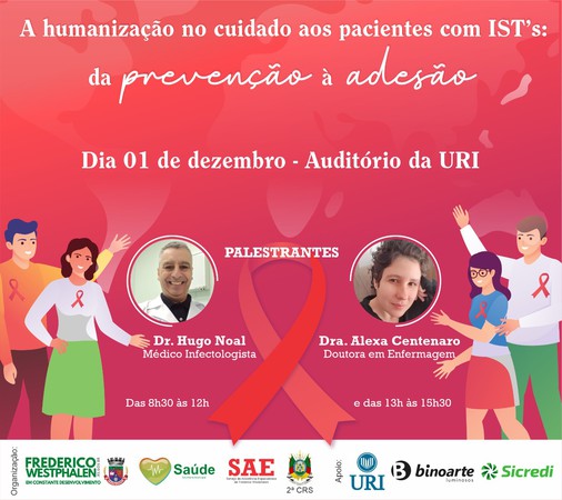 O evento acontece no dia 1º de dezembro no auditório da URI/FW, durante todo o dia. Pela parte da manhã, das 8h30min às 12 horas, a iniciativa contará com palestra do médico infectologista, Hugo Noal. Já pela parte da tarde, das 13 horas às 15h30min, haverá palestra com a doutora em enfermagem, Alexa Centenaro.