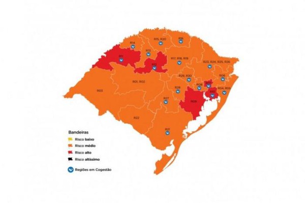 O mapa preliminar do modelo de distanciamento controlado do Rio Grande do Sul apresenta cinco regiões em bandeira vermelha. O risco alto para coronavírus no Estado está concentrado nas regiões Metropolitana e nas Missões. De acordo com o governo do RS, esse é o menor número de locais classificados nesta cor desde o dia 20 de junho (quando o mapa preliminar daquela semana foi divulgado).