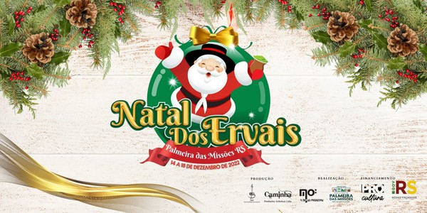 O Natal dos Ervais de Palmeira das Missões chega na sua segunda edição, e depois do sucesso do ano passado, o Parque Municipal de Exposições Tealmo José Schardong volta a ser a morada do Papai Noel. De 14 a 18 de dezembro, com várias atrações artísticas e culturais, decoração em luz e ornamentação natalinas cheias de novidade, o evento promete ser o ponto de encontro de todas as famílias nesse mês de confraternização.