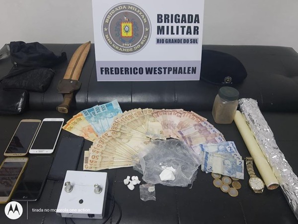 Um homem e de uma mulher por tráfico de drogas, na noite desta sexta-feira, 17 de abril, na Linha Água Azul, interior do município de Pinheirinho do Vale. Com eles foram apreendidas quatro porções de cocaína, aproximadamente R$ 1.900,00 em dinheiro, além de materiais utilizados para embalar a droga e celulares.