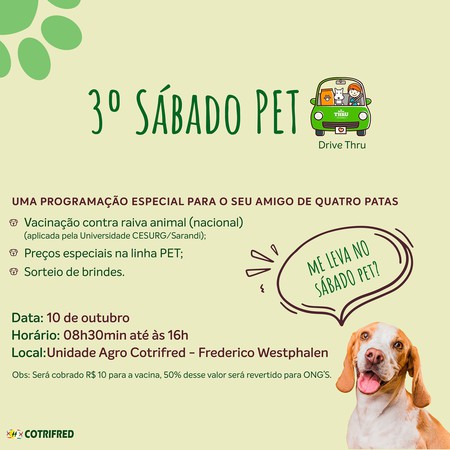 A Cotrifred realiza no próximo sábado, 10 de outubro, o 3° Sábado Pet. A atividade acontece na Unidade Agro, em Frederico Westphalen das 8h30 às 16 horas.