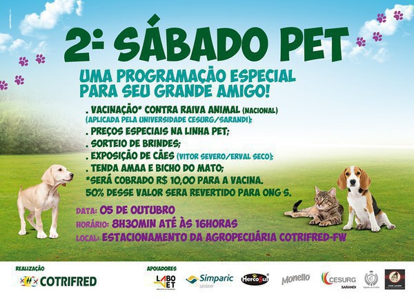 Neste sábado, 5 de outubro, a Cotrifred realiza a segunda edição do Sábado Pet, o evento será realizado no estacionamento da Agropecuária em Frederico Westphalen das 8h30 às 16h e não haverá pausa ao meio dia.