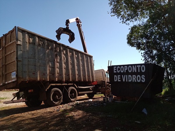 Foram recolhidos os vidros do Centro de Armazenamento instalado no Parque de Exposições Monsenhor Vitor Batistella, foram recolhidas mais de 15 toneladas de vidro.