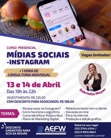 Aos empreendedores que desejam aprimorar a presença digital da sua empresa, a Associação Empresarial ACI/CDL promoverá o curso de mídias sociais com foco na plataforma Instagram, nos dias 13 e 14 de abril, ministrado pela mentora da “Loja de Sucesso”, Gabriella Meyer. O curso abordará o conhecimento sobre a rede social, como funciona o algoritmo e os motivos para as empresas estarem presentes no meio digital, além de temas correlacionados como inovação on-line, relacionamento com o cliente, ética na internet, plano de marketing digital e produção gráfica. Os inscritos ainda terão a oportunidade de realizar uma consultoria individual de uma hora com a sócio-proprietária da Flor de Café Store.