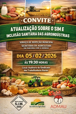 Com foco na atualização do Serviço de Inspeção Municipal (SIM) e no fortalecimento da inclusão sanitária das agroindústrias, será realizado no dia 5 de fevereiro, às 19h30, no auditório do Sindicato dos Trabalhadores Rurais de Frederico Westphalen (STR-FW), um encontro que reunirá representantes do poder público, da Agência de Desenvolvimento do Médio Alto Uruguai (Admau), agroindústrias e instituições parceiras.