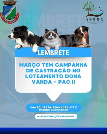 Em março, uma equipe da Secretaria Municipal de Meio Ambiente (Semma) de Três Passos estará no bairro Dona Vanda - PAC II para cadastrar cães e gatos para castração gratuita. Os animais comunitários também serão cadastrados.