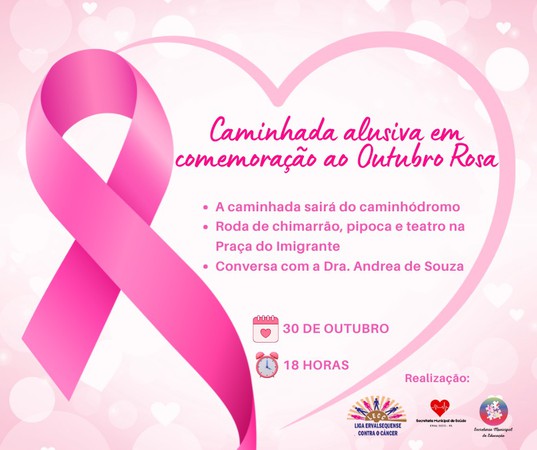 A Secretaria Municipal de Saúde de Erval Seco, em parceria com a Liga Ervalsequense de Combate ao Câncer e a Secretaria Municipal de Educação, realiza amanhã, quinta-feira, 30 de outubro, a Caminhada alusiva ao Outubro Rosa, mês dedicado à prevenção e ao diagnóstico precoce do câncer de mama.