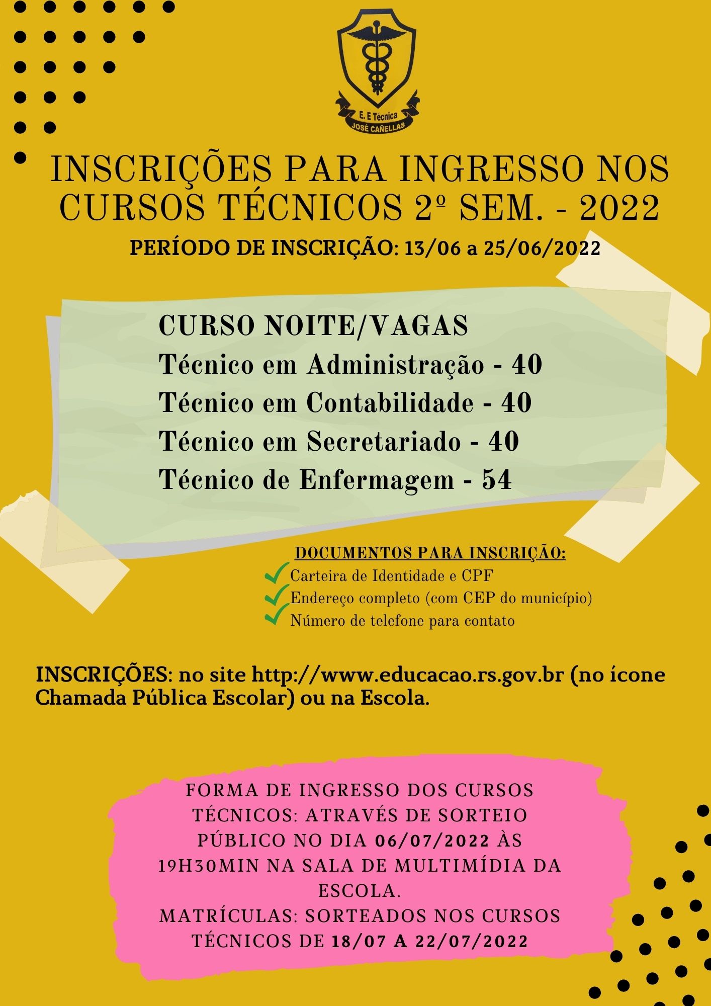 A forma de Ingresso nos Cursos Técnicos será através de Sorteio Público que se realizará no dia 6 de julho às 19h30 na Escola.