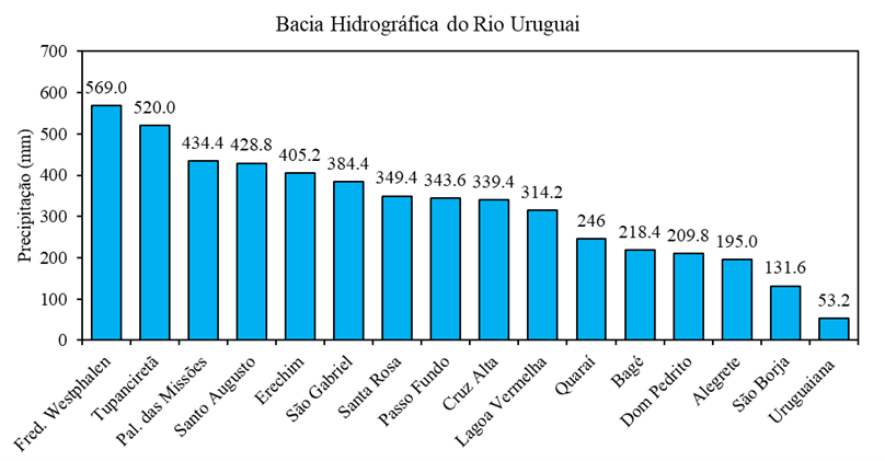 Na Bacia Hidrográfica do Rio Uruguai a média do mês é de 140,9 mm e no período foram registradas nos municípios de Frederico Westphalen e Tupanciretã - 569 e 520 mm, respectivamente. A menor precipitação foi de 53,2 mm com média geral de 321,4 mm para os 20 dias do levantamento. Sendo que, foi possível notar um maior volume de precipitação no eixo centro-norte-nordeste da Bacia do Uruguai, com os maiores volumes situados no limite superior, em municípios próximos à Frederico Westphalen e no inferior, em Tupanciretã, próximo ao município de Cruz Alta na denominada região do Alto Jacuí que já pertencente a bacia do Rio Guaíba.