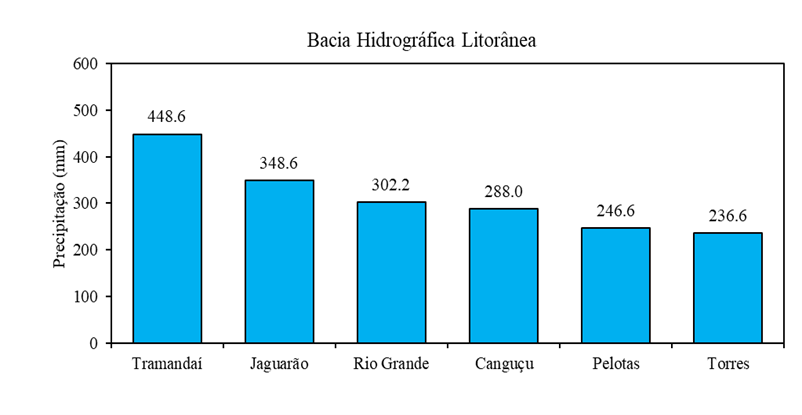 Na Bacia Hidrográfica Litorânea o maior volume de precipitação foi na estação localizada no município de Tramandaí que registrou 448,6 mm. A região de abrangência da Bacia registrou em média, precipitação de 311,8 mm que variou de 236,6 a 448,6 mm. Segundo a normal climatológica dos municípios que fazem parte desta Bacia, a precipitação esperada para mês de maio para a região é de 116,4 mm, sendo 62,7% menor a precipitação ocorrida nos 20 dias.