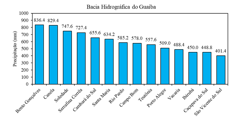Na Bacia Hidrográfica do Guaíba, as estações automáticas registraram as maiores precipitações do Estado para o período. A variação do volume de precipitação durante o período de 20 dias analisados nessa região, foi de 836,4mm a 401,4 mm. A precipitação de 836,4 mm foi registrada na estação de Bento Gonçalves que fica próxima aos municípios de Muçum, Encantado e Roca Sales, que juntos somam grandes prejuízos humanos, ambientais e materiais nos eventos sucessivos de enxurradas e inundações. A média geral de precipitação na Bacia do Guaíba foi de 603,3 mm considerado 77,8% superior para a normal climatológica do período.