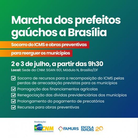 A Federação das Associações de Municípios do RS (Famurs) e a Confederação Nacional de Municípios (CNM) irão promover, nos dias 2 e 3 de julho, a Marcha a Brasília pela Reconstrução dos Municípios do Rio Grande do Sul. O evento, que será realizado na sede da CNM, tem por objetivo garantir o avanço das medidas emergenciais e estruturantes para o reestabelecimento das localidades afetadas pelas enchentes no estado.