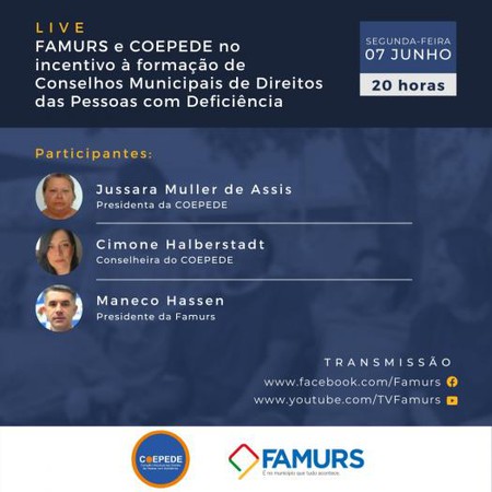 A live “Famurs e Copede no incentivo à formação de Conselhos Municipais de Direitos das Pessoas com Deficiência” será realizada às 20h, com transmissão pelo Facebook e canal no YouTube da Famurs. São convidados para o encontro a presidente do Coepede, Jussara Muller de Assis, a conselheira Cimone Halberstadt e o presidente da Federação, Maneco Hassen.