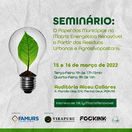 Pensando nisso, a Famurs realizará o Seminário “O papel dos municípios na Matriz Energética Renovável a partir dos Resíduos Urbanos e Agrosilvopastoris”, nos dias 15 e 16 de março, na sede da entidade, em Porto Alegre. O encontro tem o objetivo de atualizar e gerar novos conhecimentos aos gestores municipais, promovendo a integração e a troca de saberes através de palestras e demonstração de cases.
