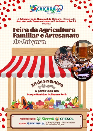 No segundo sábado do mês de setembro, 10 de setembro, acontecerá mais uma edição da Feira da Agricultura Familiar e Artesanato de Caiçara. A Feira será realizada no Parque Municipal Guilherme Perlin, a partir das 10h.
