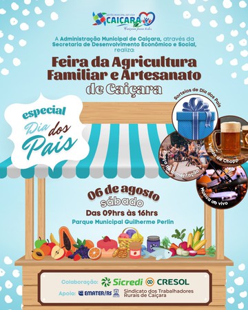 Neste sábado, 6 de agosto, acontece mais uma edição da Feira da Agricultura Familiar e Artesanato de Caiçara. A programação será realizada no Parque Municipal Guilherme Perlin, das 9h às 17h.