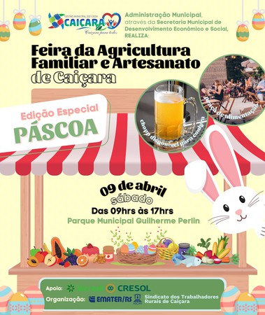 No primeiro sábado do mês de abril, dia 09, acontecerá mais uma edição da Feira da Agricultura Familiar e Artesanato de Caiçara. O evento será realizado no Parque Municipal Guilherme Perlin, a partir das 9 horas, e seguirá até às 17 horas.